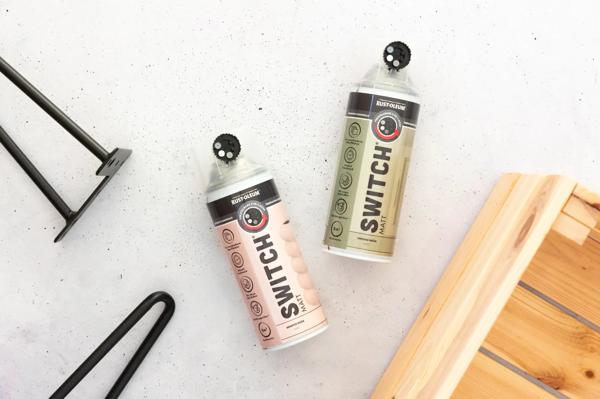 Bereite zunächst deine Arbeitsumgebung vor, indem du Böden mit Malerflies oder einer Plane abdeckst, um den Sprühnebel aufzufangen. Nimm dann deine Holzkiste und deine Sprühfarbe SWITCH zur Hand. Stelle die Dose auf Einstellung 5 (Horizontaler Strahl) und besprühe die Holzkiste gleichmäßig von allen Seiten. Die Farbe haftet optimal auf Holz und sorgt für ein deckendes, ebenmäßiges Finish. Lass die Farbe trocknen – sie ist schnelltrocknend, also ideal für spontane Projekte!