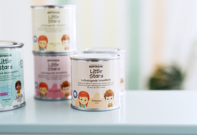 Wir zeigen dir, wie du mit unserer Rust-Oleum luftreinigenden Wandfarbe aus unserer Kinderlinie Little Stars in den Farbtönen Kürbiswagen, Zauberwald und Goldene Locken Schritt für Schritt deine eigenen Boho-Akzentwand in Pastell kreieren kannst.